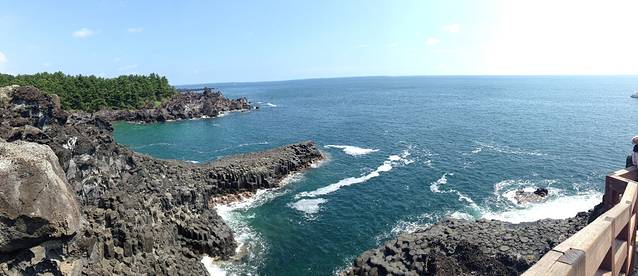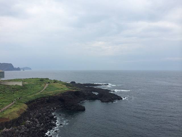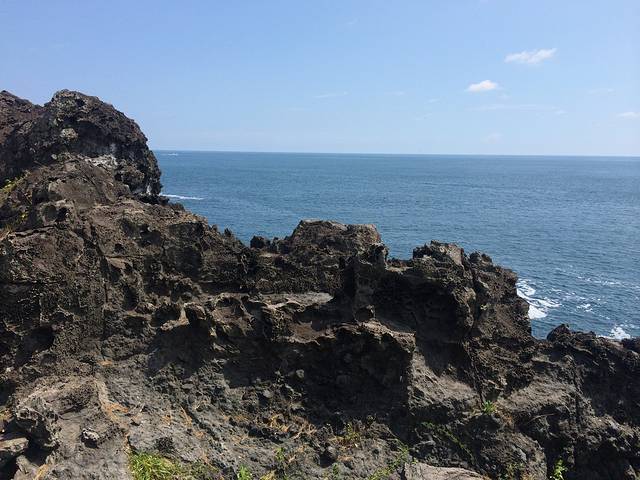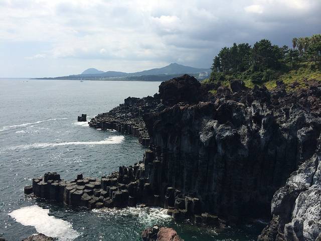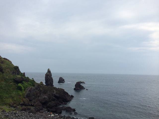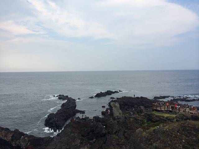 我们去太阳海滨酒店(Sun Beach Hotel,Jeju),大概一个小时就到。新庆南酒店下车对面便到。跟前台用英文交流,她英文很不错,虽然我们几个英语专业毕业的基本忘光光,但基本交流还是没问题的,发现济州的酒店都是下午3点才可以check in,只好先放行李,去附近便利店泡面、牛奶,解决肚子,回酒店check in,后坐600到ICC(济州国际会议中心),直接跟售票员报ICC就可以了,步行至柱状节理带,东南西北说起来可能不太容易理解,建议百度地图、谷歌地图搜搜导航去。如果是我们这个方向的话,下车是站台,面对站台右手边,过马路一直往前走,看到路标右拐就到了。拍了些照片,就是太晒了。大太阳拍海景还是漂亮的,有很多旅行团,人还可以。