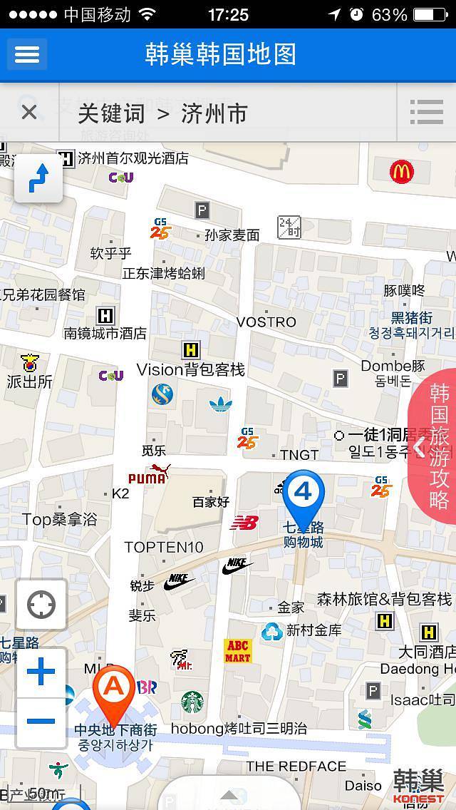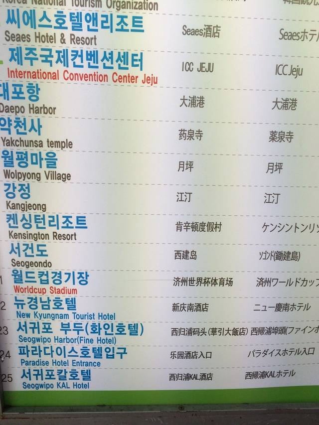 坐600回机场附近,山坡过个马路便是回去站台。倒数第二站可以下车打的到我们的目的地酒店,不想烦的直接到机场吧,济州市离机场很近,打的就可以了。我们四人四大箱子得两辆的。打的时准备好入住酒店名称电话地址等,最起码有个电话,有的司机找不到。我们在济州市区住的是济州岛首尔观光酒店,大门外有很多小旗子,韩文名字。还是下午三点后才能check in,先去吃午饭,酒店西边,也就是出门左手边往前走是吃的店,吃了炸鸡,还有泡菜锅等,往前一点对面是e-mart超市,里面可刷银联。酒店右手边是各种便利店。出酒店门往右往南,也就是往东往南一直走可以到济州市地下商街,不远。地下商街东部是东门自由市场。黑猪街在酒店东部不远。黑猪街过个马路对面感觉是鱼街,有鱼图标。
