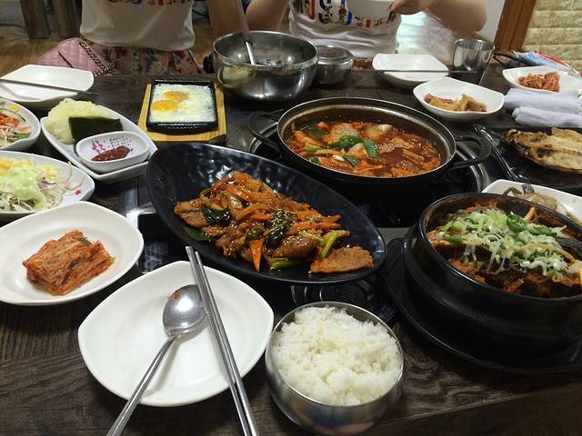 我们此行是四人一起,分摊,比较划算,该吃的喝的都有,如烤肉、黑猪肉、炸鸡、米酒、海鲜、鱼类、冷面、泡面、参鸡汤、橘子汁、泡菜、饭团、牛奶等都尝过,饮食可以。吃饭的话偏冷酸辣,大家肠胃多少有些不适。