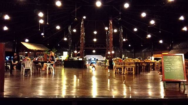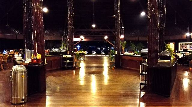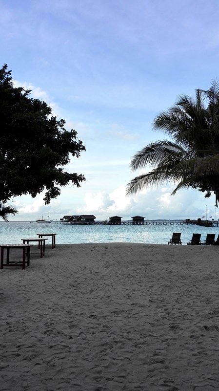 栈道尽头一块牌子上书“POMPOM RESORT”,很简单。再往后面走一点就是餐厅兼综合服务的地方,东南亚风格,全木,地板是木的,木头柱子光滑发亮,屋顶是木头的房梁,简单无修饰。进餐厅需要脱鞋,一方面是马来西亚进屋脱鞋的传统习惯,另一方面我觉得是因为鞋底有沙,会磨伤地板。入乡随俗,赤脚踩在地板上还蛮舒服的。