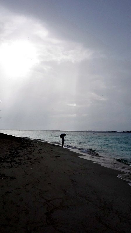 半夜里听着窗外的雨声,心想:“唉,天公不作美啊”。一早起来仍然在下雨,看着外面寂静的环境,一个人都没有,太静了,感觉像到了一个荒岛上。随意出去逛逛,沙滩上除了我们仍然是一个人都没有,小九看着远方若有所思,雨丝连绵,思绪也连绵,不可说雨无人沙滩实在是个发呆的好地方。