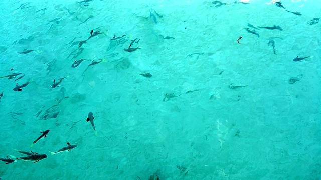 海岛周围一圈的海水颜色与深海不同,猜下是什么样的?我用一个自创的词形容:牛奶蓝,想想看,蓝色加入牛奶,对,就是这样的颜色。近岸边的海水很清澈,接近透明了。怎么会有这么美的地方啊。