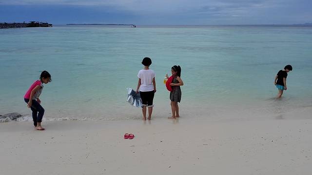 岛上的卖点是浮潜,看水里的各种珊瑚各种鱼各种生物。略作休息后,不光是娃大人也按捺不住迫切的心情,再一次见到大家的时候,基本都全副武装准备下水。也许是时间接近六点,海水有点涨潮,再加上微风,一点点波浪打破了原有的平静,鱼们也不知道躲到哪里去了,徒留海面上的夕阳孤独地占据半个天空。