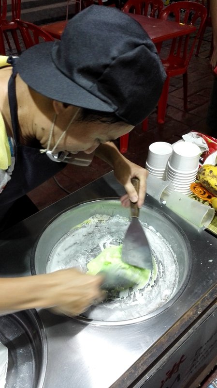 炒雪糕,是吃完黄亚华出来看到的,这么奇特的东西,就算吃的再饱也要尝试一下。说是炒,其实是冷搅拌,平底容器下面应该是个保冷的机械,摊主把一些溶液倒进平底容器,用铲子搅拌,一直到凝固,铲成卷装入纸碗里,再加上一些糖果装饰物。原材料是香草味,薄荷味,巧克力味及果味等的液体,放在小冰箱里;价格6元起;裝碗以后的形状像一朵朵盛开的玫瑰。小九选择了薄荷味,吃个没停,好像刚才的晚饭不是她吃的,我尝了尝,薄荷味比较重,就不会显得太甜,还可以。