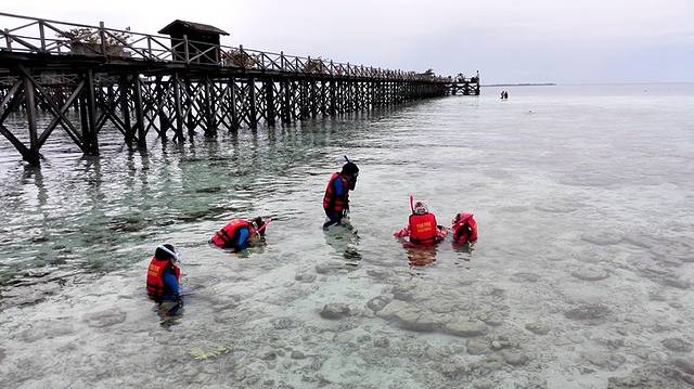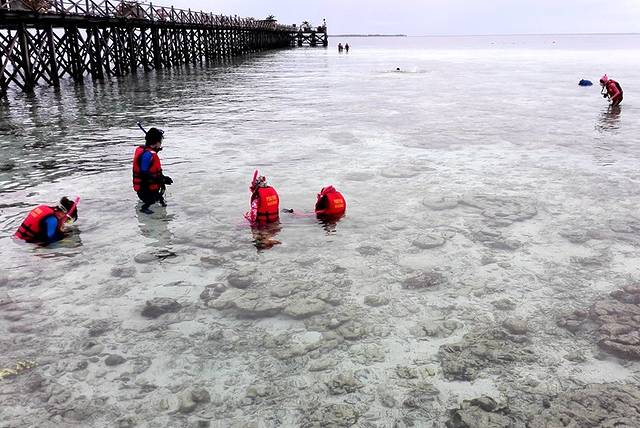 早餐后我们惊喜的发现,退潮了,接近岸边的水域,完全是透明的,如同泉水一般,水底的沙子一粒粒的沐浴在阳光下,水面缓缓的流动,如同微风轻拂皮肤。即便栈道尽头的海水也不深,也才到膝盖上面,石头珊瑚等等都快要显露出水面。浮潜实在是个技术活,需要掌握好呼吸管的规律,需要用嘴巴吸气呼气。只有这样才能趴在水上,看到水里的各种美丽的事物。当你带着面镜,用着呼吸管,漂浮在水面看着水下世界的时候,让人错以为就像在真正的深海一样。水里的珊瑚有各种形态,鱼儿颜色鲜艳,海星也很有特点,居然是蓝色的,是为了呼应这里水的颜色么?它们只有呆在海里才是最漂亮的,离开了熟悉的环境,就失去了应有的魅力。近期有人跳岛去马步岛时,摘走了海底的珊瑚,还在朋友圈炫耀。针对此类行为,马来政府的对应措施是禁止非马步岛住客上岛;少数人的行为损坏了大多数人的权益,真是令国民蒙羞。