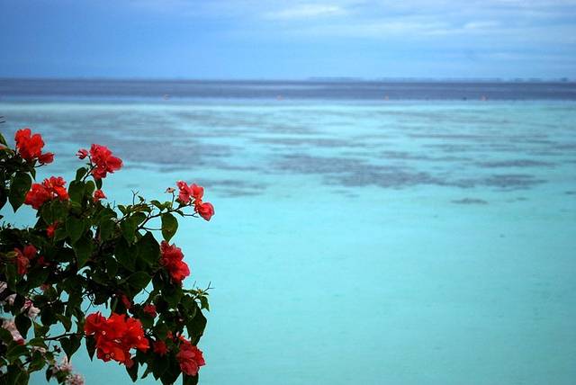 珍珠岛的右前方就是邦邦岛了,远远地看上去就像一片有着树的大沙丘,平平的,和我想象中的不太一样,脑海中的影像邦邦岛是有小山的岛屿。终于上岛了,传说中的木栈道深入海中,和网图一样的花,美。水屋只有几间,太少。