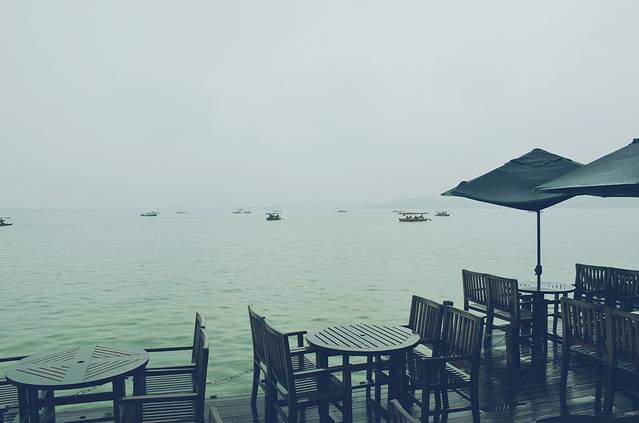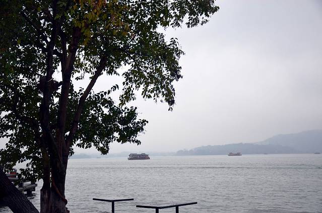 岸边可以喝茶,当然是收费的,想一下这里的视线应该很棒,可惜下着雨,无人坐在这里赏景,相信很多人和我们一样,难得来杭州,西湖一定要去的,即便是下雨天,即便是不能静静的欣赏,也要路过一下。。。