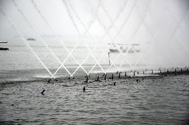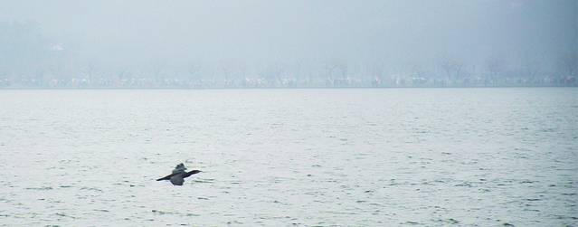 展翅飞起的海鸥,在这片水上显得格外孤独