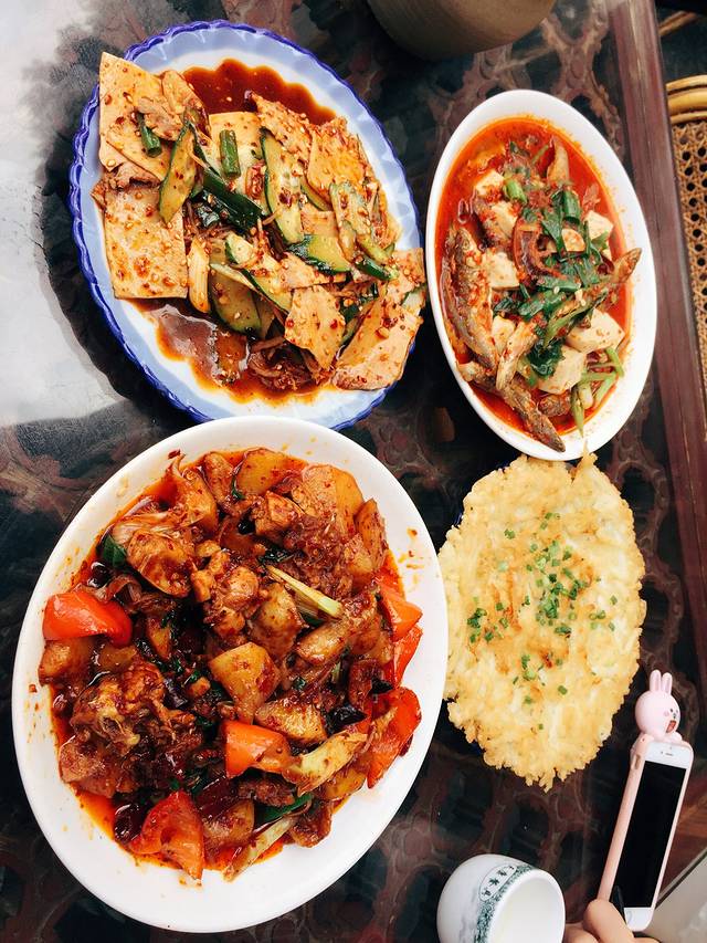 喜洲古镇上的院子口也是强烈推荐,银鱼煎蛋太实诚了,银鱼成丝都看得到,口感超棒,黄焖鸡量很足口味也很地道,原本点中份,老板直接给下小份儿的,分量正好。
