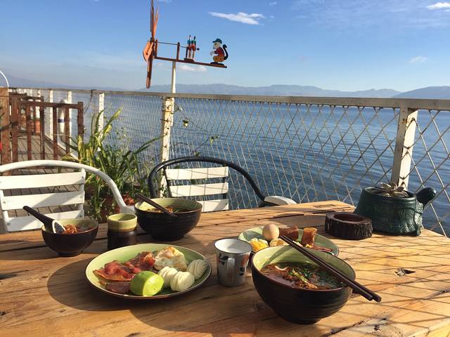 海西住的是波蓬的菩提海居尘外的海景房,它的好处在于安静,阳台的一整面玻璃窗正对洱海,让人能够完全的安静下来,放空自己,早晨更能坐在阳台直接看到日出的美景。早餐也算丰富,还可以点上一碗现做的热腾腾的云南米线,坐在紧靠洱海边上的卡座上,赏美景吃美食,惬意而悠闲。客厅里有很多免费吃的水果和零食,也可以在一楼享用云南的特色茶艺。
