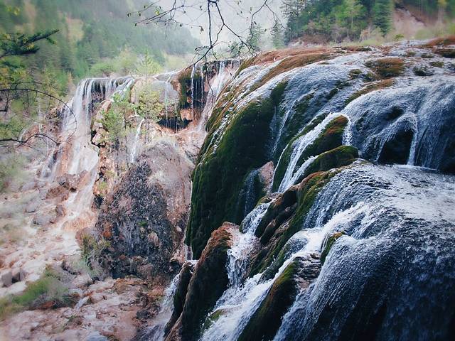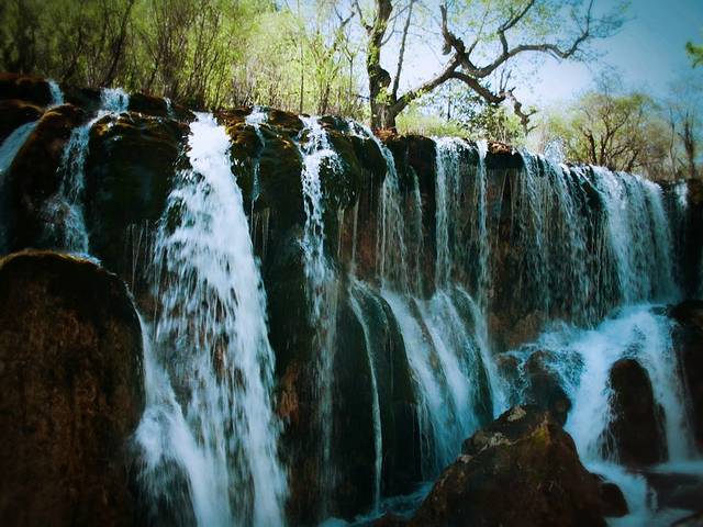 在山丛密林间奔涌穿梭着河流,形成无数个大小瀑布。其中诺日朗瀑布是国内宽度最大的瀑布,它从高耸的岩石间凌空飞落。走在悠长小路中,随处可听见叮咚的瀑布声,这里不愧是一个瀑布王国。