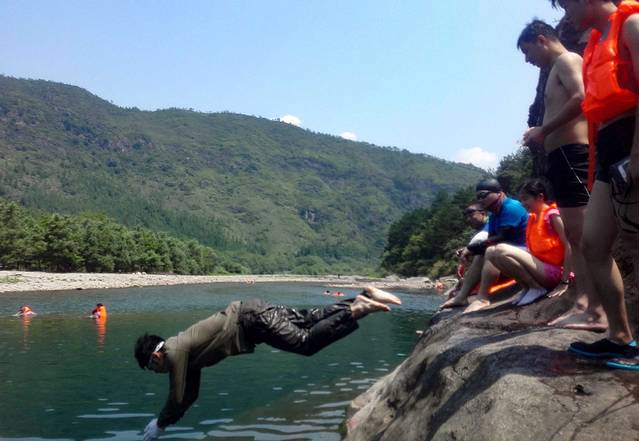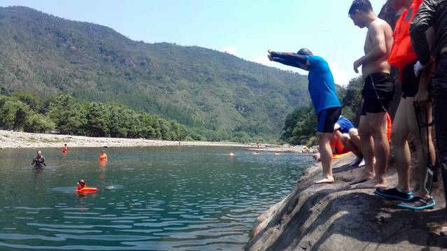 大家先逐步感受水温,在38度太阳的直射下,水里温温的。