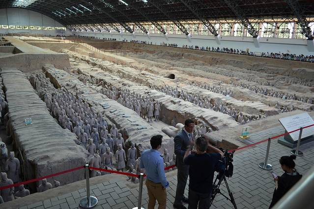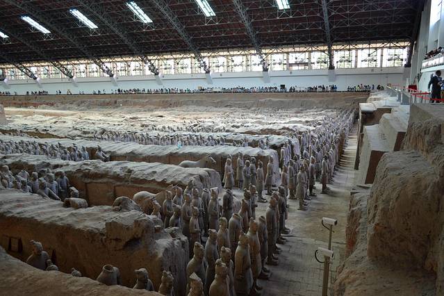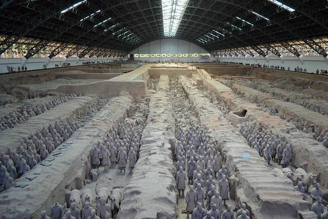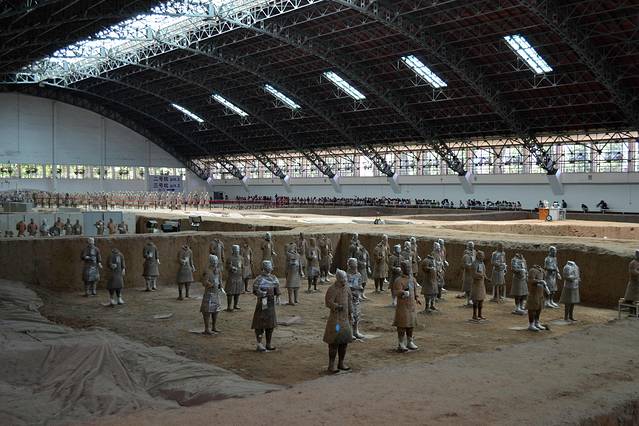 秦兵马俑坑发现于1974年,被誉为“世界第八大奇迹”、“二十世纪考古史上的伟大发现之一”。三个兵马俑坑成品字形排列,总面积2万多平方米,坑内放置与真人真马一般大小的陶俑、陶马7000余件,具有很高的艺术价值。兵马俑的塑造,是以现实生活为基础而创作,艺术手法细腻、明快,陶俑装束、神态各异。具有鲜明的个性和强烈的时代特征。俑坑内出土的青铜兵器有剑、铍、矛、戈、戟、殳、弩机以及大量的箭镞等。大部分兵器历经两千多年依然锋刃锐利,表明当时已经有了很高的冶金技术。1980年,在秦始皇陵西侧,还出土了两乘大型彩绘铜车马,每乘车前驾有四马,车上各有一御官俑。铜车马造型逼真,装饰华美,大量使用金银为饰品和构件,制作非常精巧,被誉为“青铜之冠”。