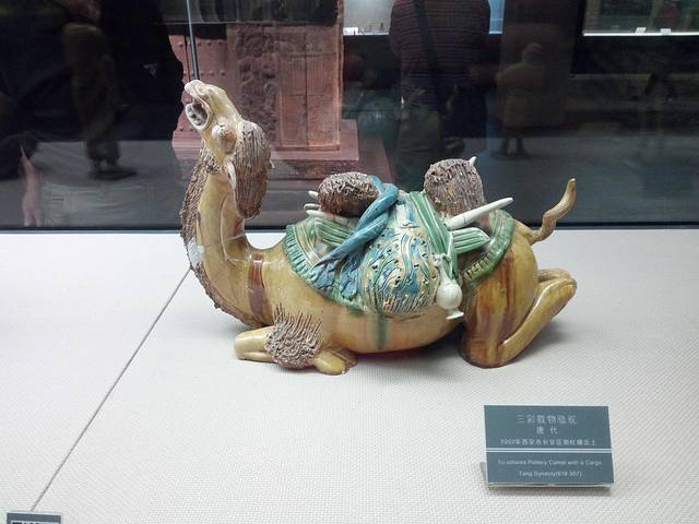 唐三彩是一种低温釉陶器,釉色有黄、绿、褐、蓝、黑、白,其中,黄、绿、褐为三种基本釉色,故称唐三彩。因釉料中含有大量助熔剂———铅,使釉的熔点降低,在烧制过程中表面釉料向四周扩散流淌,各种颜色浸润交融,形成一种自然班驳瑰丽的三彩釉。