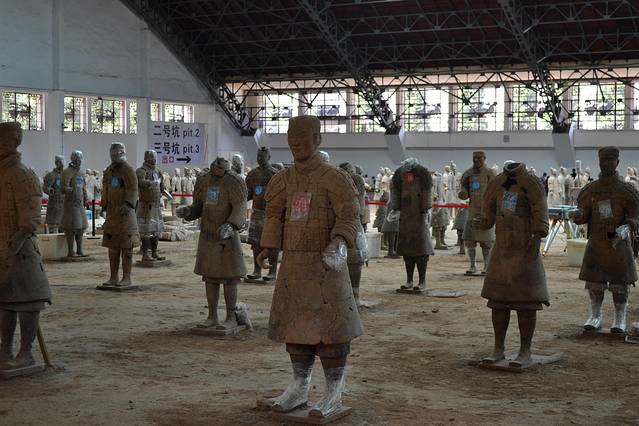 秦始皇陵兵马俑一出土就震惊世界。现在我们看到的人俑都是土黄色灰色的,其实兵马俑在刚刚出土时都是彩绘的,颜色描绘精细艳丽,但在出土的瞬间,这些色彩全部脱落,兵马俑变成了现在这样。连考古学家们对此也手足无措,只能眼睁睁的看着这些彩俑变成灰色,却阻止不了。