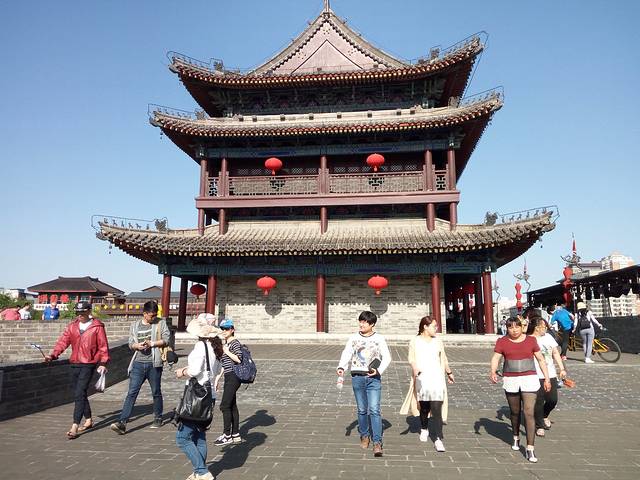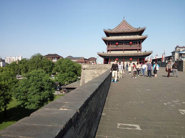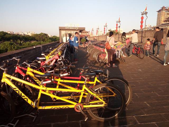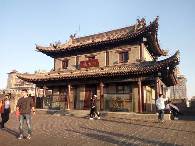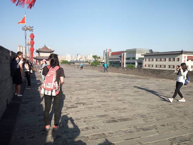 古城墙门票54元,租自行车80元/2小时。城墙景区呈长方形,墙高12米,底宽18米,顶宽15米,总周长13.74公里。2个小时的时间还是蛮紧的,我前一个小时只骑了四分之一,时间都用在拍照游览上,后一个小时没命地踏,最后竟然骑过了租车点,又折了回来,但正好2个小时退车。