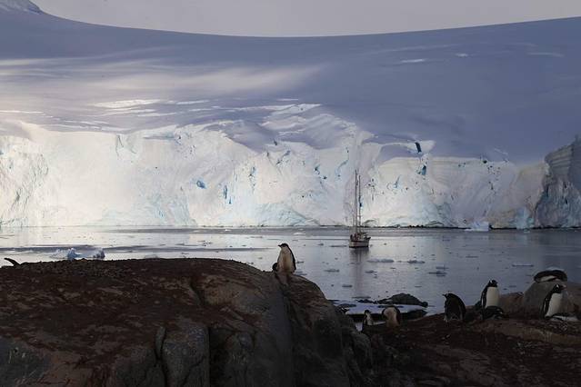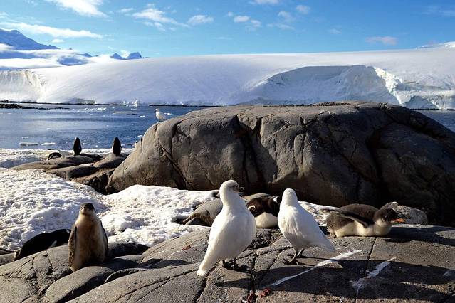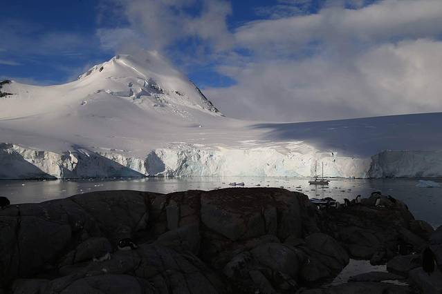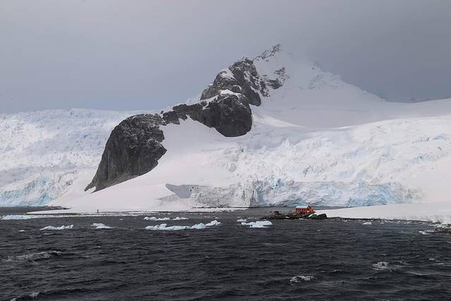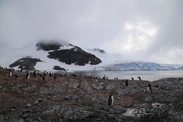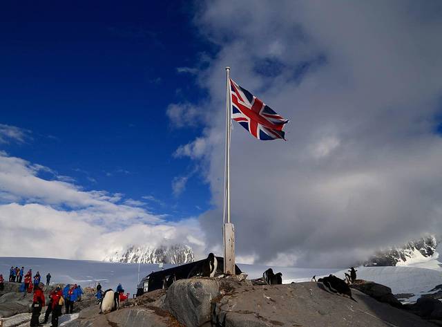 穿出雷麦瑞海峡就是洛克罗伊港,也就是几天前因为极端天气取消的登陆地。今天的洛克罗伊港天气非常不错,英国的基地A建立在此,忠实的护旗手是岛上的白眉企鹅,来南极前曾以为在这样的纯净世界每天呈现给我们的都将是一副天蓝海清冰白的图画,其实十多天来我们只有三四天时间见到晴空万里的光景,天空更多的是变化无常的南极灰,不过我很喜欢这种灰调,没有雾霾只有水汽,常常可以看到海市蜃楼的样子。