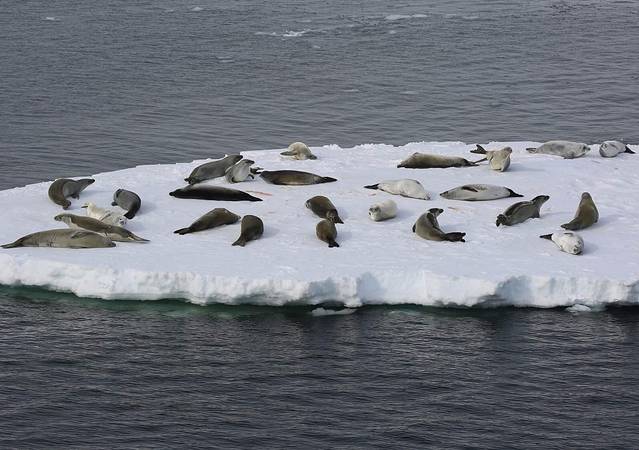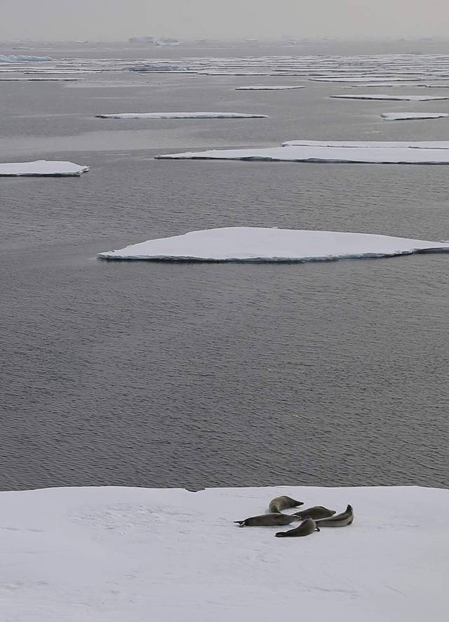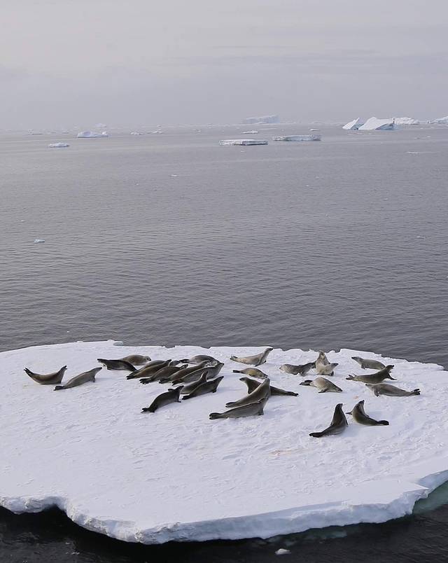 海面的浮冰密度越来越大,好多看起来刚刚没分裂开多久的样子。房间里的坐标显示器告诉我们已经到达了南纬66度18了,意味着南极圈马上就要快到了。甲板上聚集的人越来越多,大家都一脸喜庆,期待节日到来的样子。浮冰上的食蟹海豹也越来越多,有的浮冰上甚至密密麻麻。对鲸鱼特别喜爱的黑曼巴说这里应该虎鲸会有很多,因为食蟹海豹是它的主要美食。