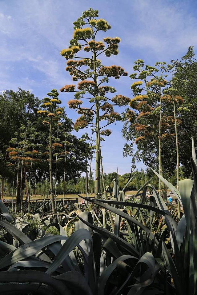 饭后去参观女人桥,司机停车在公园附近,远远就看到有一片美国剑麻长势很夸张,不禁驻足细看。生平第一次看到剑麻真的开出了七八米高的花。我记得有过剑麻开花的描述,如果真这般疯狂地开花了,它也就离死期不远了。