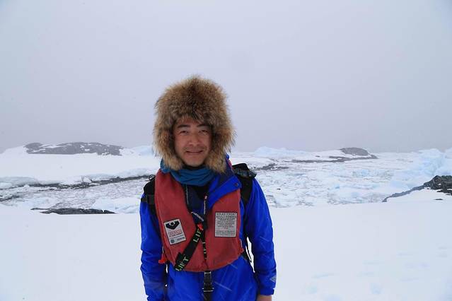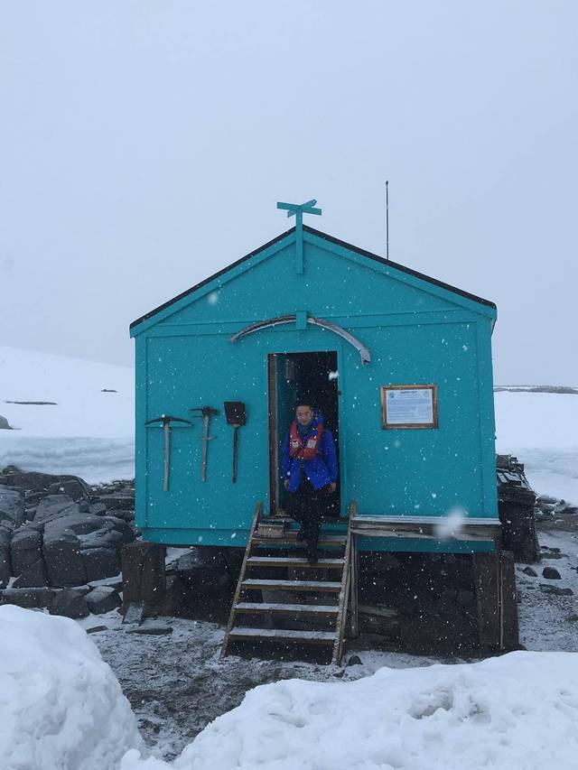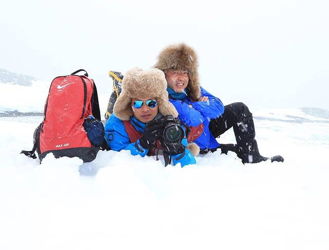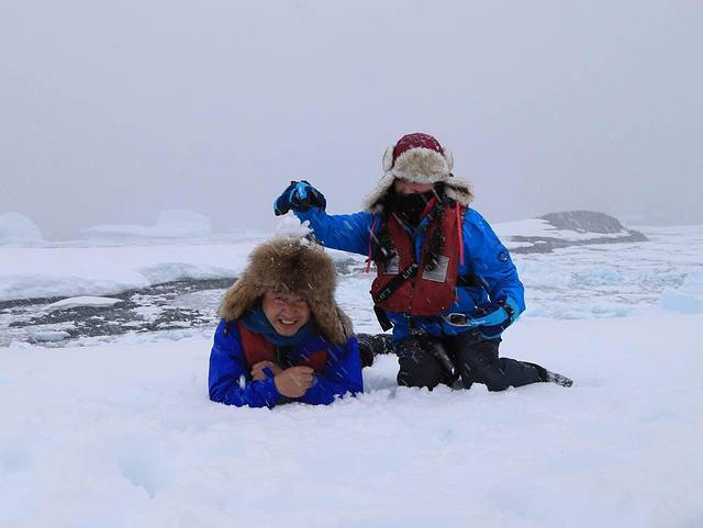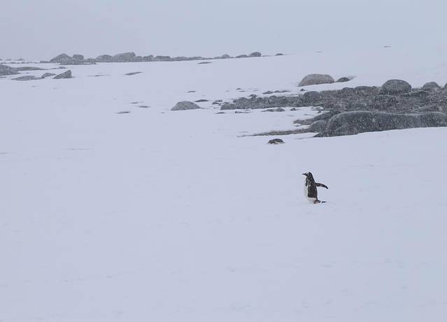 船外白雪皑皑,登陆的每个人都特意穿得很厚实,我也加上了反光的“保温杯”。徒步在厚厚的雪地里,虽然雪越下越大,我却热得大汗淋漓,原本裹得严严实实的我不由得脱帽敞衣。很多人会以为南极天气是让人冻得让人窒息的节奏。其实并非这样,只要不起风,此时正当夏季的南极也许还没有前些天降温的成都更冷。