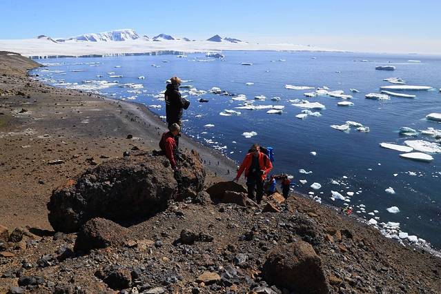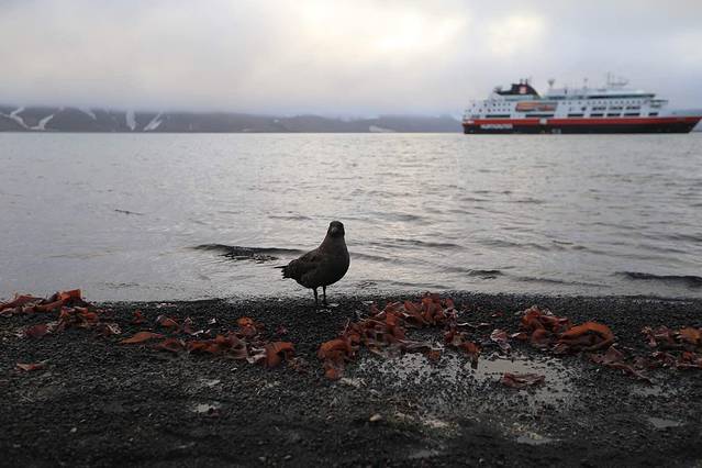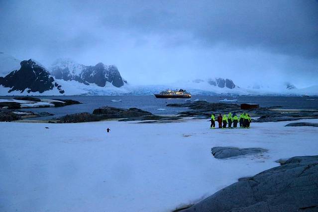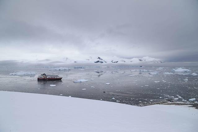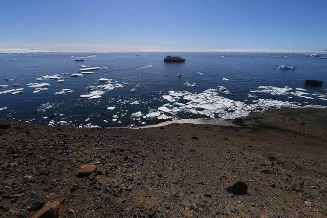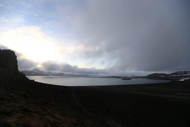 船继续前行,到达天堂湾的时候,天色大亮,阳光照进了船舱,正当大家都以为马上就要登陆布朗基地的时候,船方又通知今天由于大风天气布朗基地的登陆活动同样也取消了。幸运的是,虽然不能登陆上岸,但是我们已经可以在甲板清楚地看到基地的全貌以及布局。