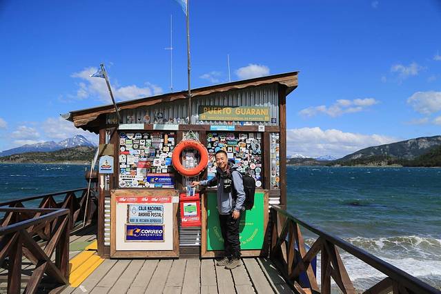 保护区内有一个地球最南端的最小邮局,就在由海边沙滩延伸到海里的小木栈道上。里面的老邮差每天都会为来自世界各地的游客在这里盖戳发信,出售印有“世界尽头邮政”字样的明信片,我们的到来忙坏了这个老邮差,一瞬间就排起了长队,我怕人多,拿着疯子率先盖好邮戳的明信片摆拍了一下。