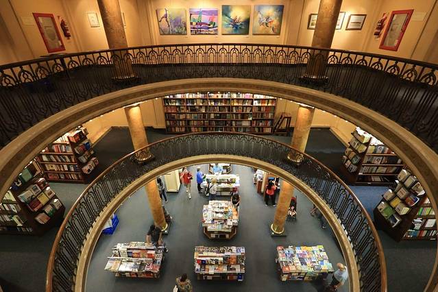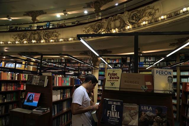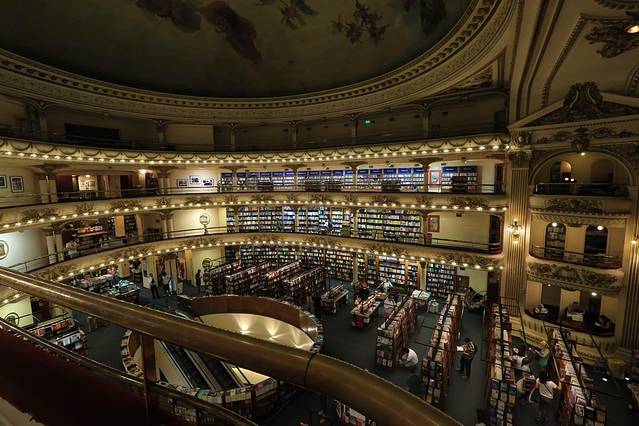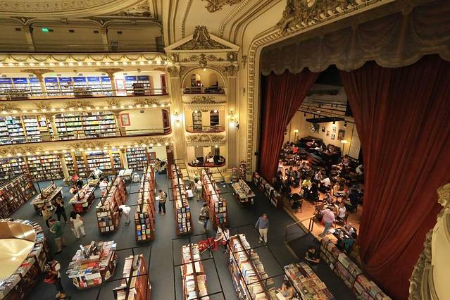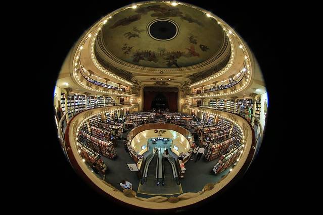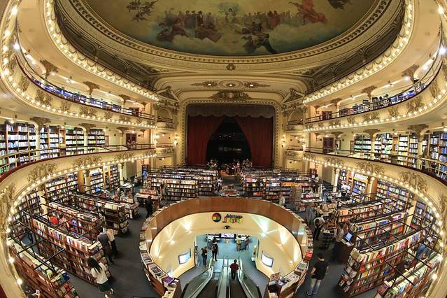 在布宜诺斯艾利斯有个被评为“全世界第二美丽的书店”。书店的与众不同在于它是由一栋上百年的歌剧院改建而成的,这就是——El Ateneo书店。书店的设计师利用之前歌剧院的空间布局而进行了独具匠心的设计,让这个书店真是亮瞎了眼呢,书店内的雕塑与壁画均出自名师之手,感觉就像走进了皇室的图书馆一样。穹顶、天花板、希腊式柱子、精美浮雕、欧式吊灯以及舞台全部基本不动的保留了下来,而原本大厅里的坐席已经撤走,放上一排排书架。舒适幽雅的剧院包厢被改成小阅览室。 舞台则变成最高上座率的咖啡厅。据说咖啡厅“菜单”都是按照乐谱编制的,点点滴滴煞费苦心。成都的"方所"固然也养眼,但充满岁月痕迹的El Ateneo让人更有感觉。
