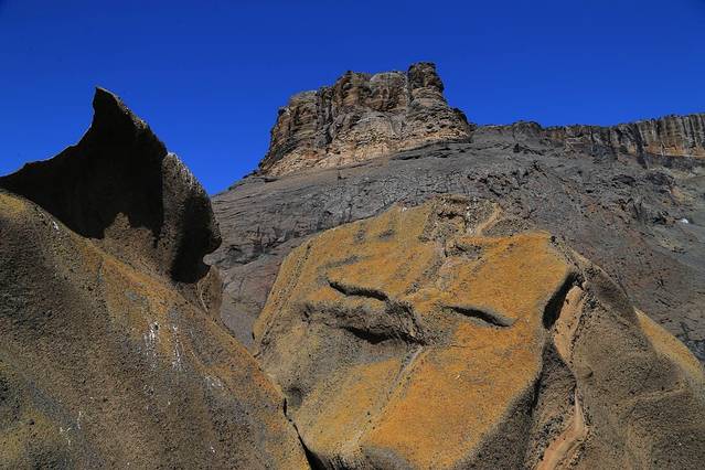 黄色陡崖的登顶一路都是大大小小松动的火山熔岩和碎石以及火山灰。山崖陡峭徒步上山万分惊险,后来总结出一个好办法,就是先用脚后跟落地,这样踩在幸好摩擦系数较高的火山岩碎石上走起路来还比较有效果。