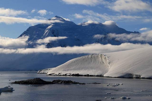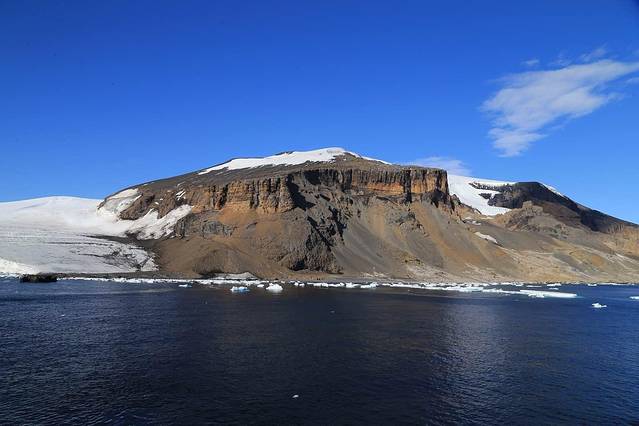 布朗断崖处于南极半岛的最高点,以高达745米的悬崖绝壁著称,由于富含矿物质,岩石呈斑驳的锈黄色。山脚下的一块巨石怎么看都满颜堆笑。