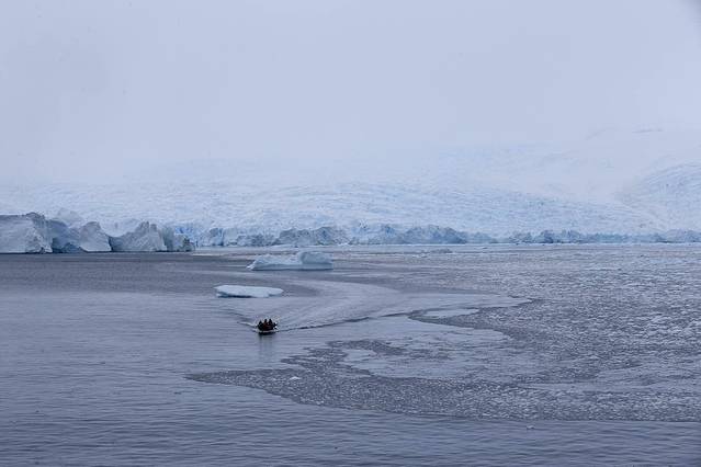 黄色陡崖又叫布朗断崖,这个山崖周围大部分被冰山封锁,今天这处登陆地也是浮冰包围。轮船停在离断崖岸边500米远的水中央,我们则坐快艇登陆。