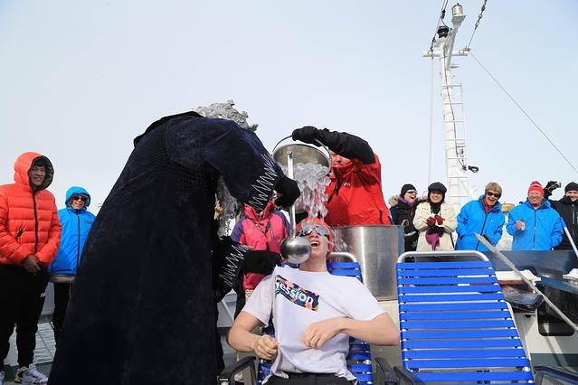 抵达南极圈,船长拉响了汽笛。整个甲板都沸腾了,大家都在欢呼庆祝我们到达了66。33。甲板上备好了香槟和冰桶。每个人脸上都洋溢着过节的气氛。今天又是我们中国人的除夕。