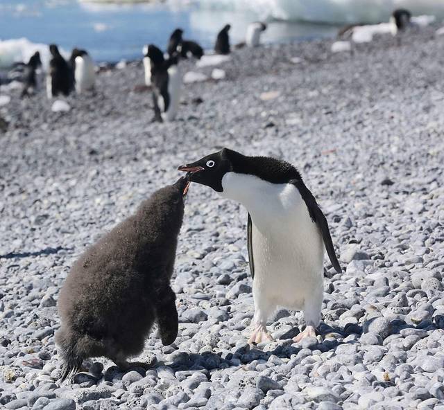 阿德利企鹅是我最喜欢的品种,它只有最为简洁的黑白两色,身材相对其它企鹅而言属于娇小玲珑型。在南极是最为常见的企鹅种类。而最萌的是在黑色的脸上还有着白色的眼圈。阿德利企鹅在幼崽的时候浑身都是灰黑色的长绒毛,逐渐长大的过程也是褪去绒毛的过程。企鹅母亲超有母爱,随时都在给小企鹅喂食。据说阿德利企鹅实行严格的一夫一妻制,即使丧偶也不再嫁娶,直至终老。