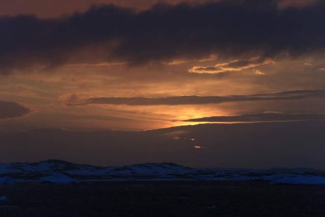 南极的夏天在极点附近会有半年的极昼出现,但是在南极圈附近一年中也只有一天会日不落。尽管如此,南极的白天也会有18个小时以上。习惯了日出而作日落而息的我这些天生物钟一片紊乱,凌晨两点看到船窗外的天空已吐鱼肚白,虽然一直惦记着看日出,但迷糊中睁开眼睛的时候朝阳已把房间已映得闪着金光。赶紧跑上了甲板,高老师已端着他600的大炮在此守候了好久。
