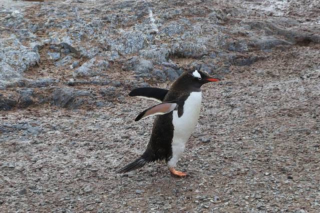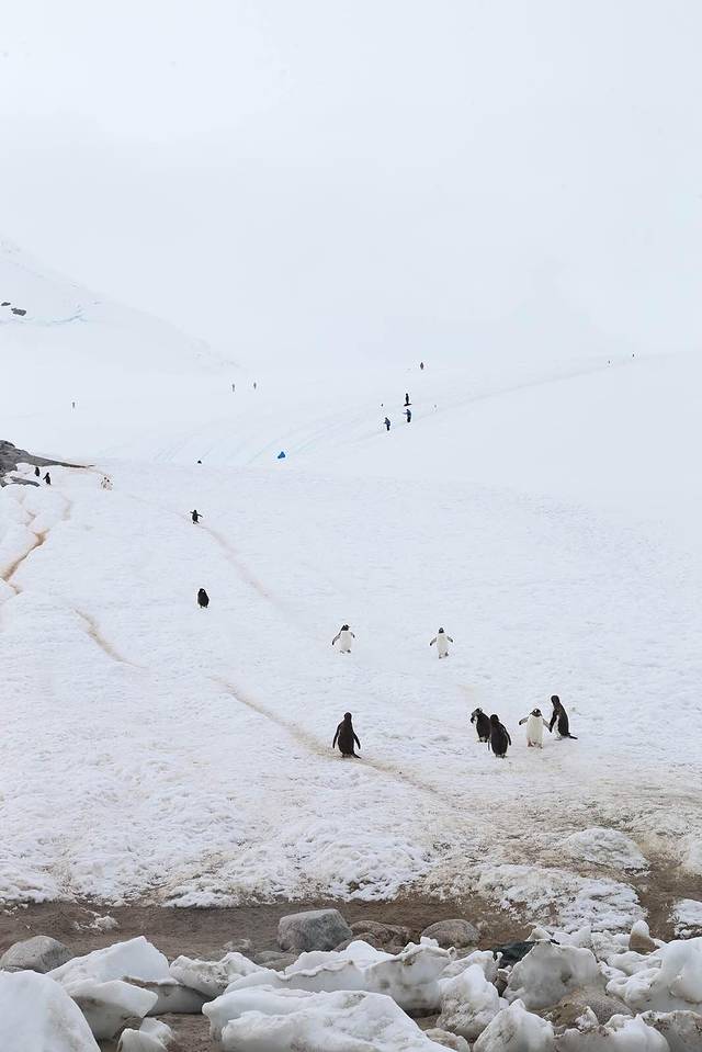 在半山腰裸露的岩石堆是企鹅的巢穴也是主要聚集地,憨态可掬的企鹅总是摇摇摆摆穿梭于山上的巢穴和山下的海滩之间,在雪地上形成几条长长的"高速公路"。
