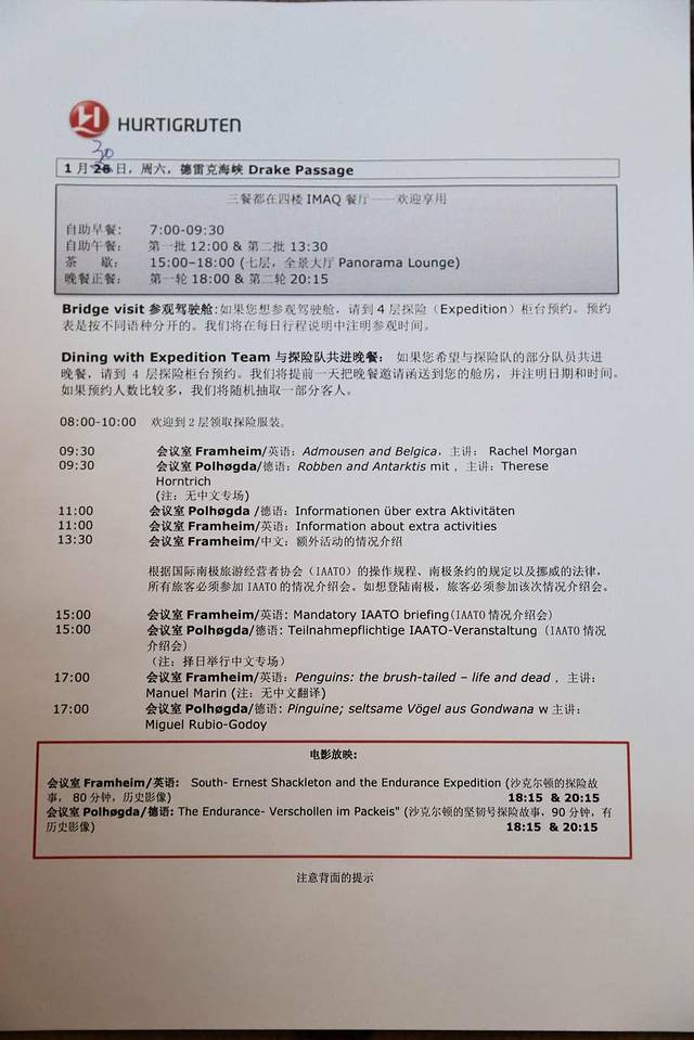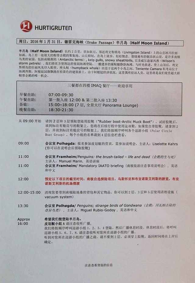 今天的通知书,船上每天都会安排有关南极的各类讲座,我们会参加今天一点半的活动,小伙伴刚刚打探到有可能会安排登陆中国的长城站。