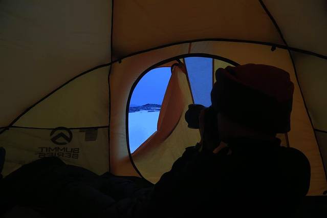 昨晚在帐篷里睡得真香,迷糊中似乎听到了自己鼾声如雷。隔壁两老外估计失眠,很早就在帐篷里窃窃私语。六点多的时候我们都起床了。厚厚的连裤防寒服要穿上也很要费点力气,等我跟黑娃儿笨手笨脚收拾好睡袋和帐篷的时候又折腾一身臭汗。船方的露营向导有条不紊的指挥大家回撤到船上。很难忘的一次极地露营。