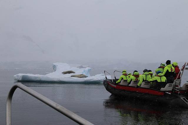 坐船巡游是报名参加的自费项目,可以更近距离的观看这个海域的野生动物。巡游艇穿梭在满是浮冰的海上,两边尽是壮丽的冰山,快艇撞击着海面的浮冰发出咚咚脆响。此时天上飘起了鹅毛大雪,并随有些割脸的海风扑打着我们。我不禁打了个寒颤,双手握紧了裤兜里的暖宝宝。