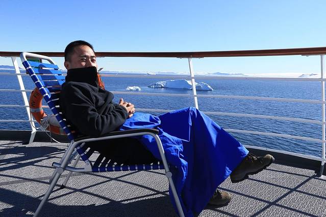 早晨七点,电话约伙伴们共进早餐,结果个个睡意正酣,恋床不起。估计昨天参加多个项目累坏了,还有则是这些天的美景让大家的激情过于迸发,如今已少了许多兴奋,多了些麻木。能吃贪睡也是来南极的一个重要变化。 说到吃,不得不说船上有个美女主厨,人家可是蓝带厨师哦,每天餐厅的的菜品都会有变化,连最挑食的黑曼巴每天都能找到他认为秒杀大多饭店的美食。极地的气候也让人会常常很快进入饥饿状态,进而胃口大开。说到睡,有人说来南极嗜睡是因为地球的磁场,至少我自己的感受是若是真想睡觉了,真可以就地立马而眠。小喇叭一天可以睡十多个小时,这是什么样的养膘节奏啊。