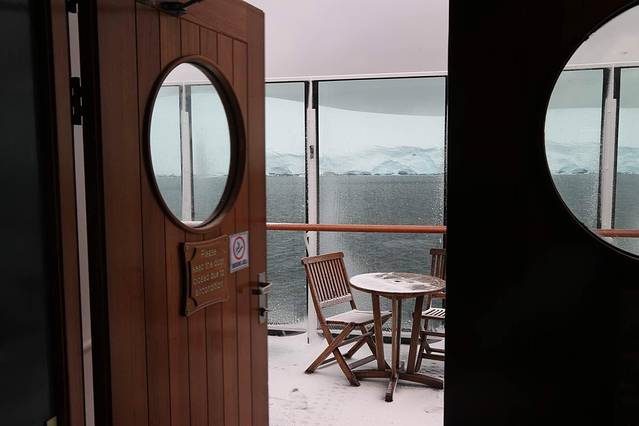 船夜里一直沿着海峡一路向南,早上八点的时候到达了洛克罗伊港海域的时候海面狂风大作,水面波涛翻腾,这种天气恐怕我们自己都认为不敢去登陆。船方通知停船就地等待看天气能否好转。时间慢慢过去,天空竟又下起了漫天的大雪,雪花被大风吹成了一道道横扫的直线。这样的景象我们都还是第一次见到。天气状况越来越糟糕了。等待到上午十一点时候,船方抱歉的通知大家,今天上午的洛克罗伊港的登陆活动不得不取消。不过我们的护照被船上的工作人员拿到岛上去加盖了邮戳做纪念。只是本想到岛上去寄出明信片的钰有些小失望。同为第八登陆小组的伙伴们估计也有些失望,因为终于今天轮到我们率先开始登陆的时候,活动居然由于天气原因取消了。船方打算启锚前往布朗站,天气预报说今天布朗站天气不错。