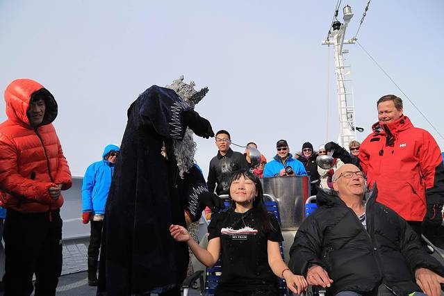 甲板上不管男女老少激情高昂,不断有人前来挑战冰桶寒冷。都来南极洲了,还怕啥冷呢。