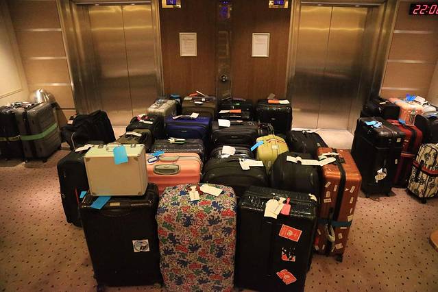 行李箱都挂上了前进号特有的标识,按照船方的要求我们必须在晚上十点前将行李打包好推到房间门口,工作人员会前来取走我们的行李箱。刚过十点,伙伴们都各自在房间等待前来提取行李的前进号维特尔,过五分钟还没来,过十分钟还是没来,疯子好着急啊,会不会搞忘我们啊?