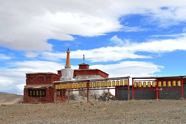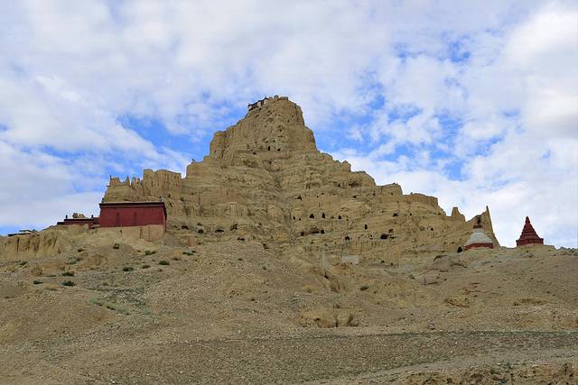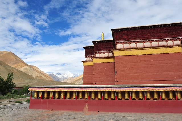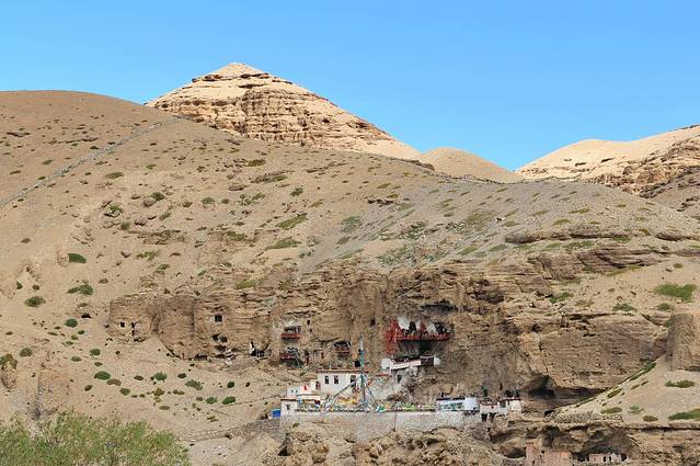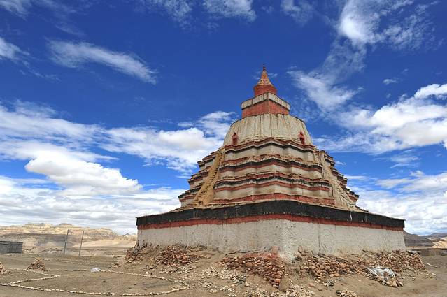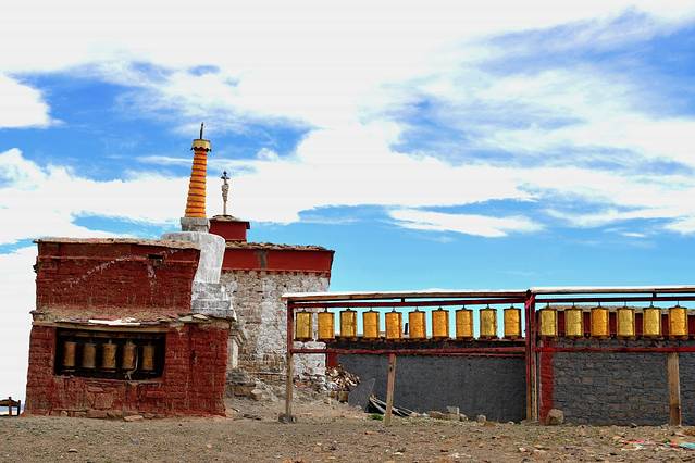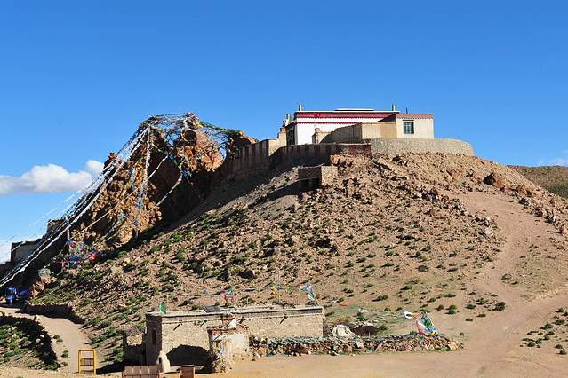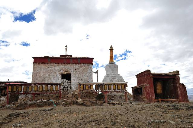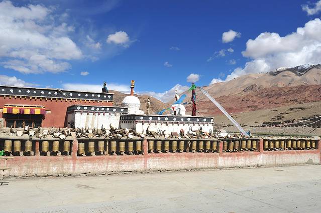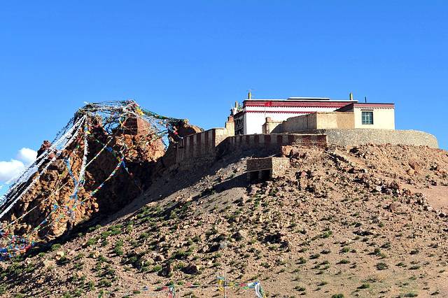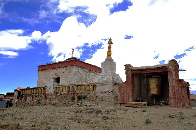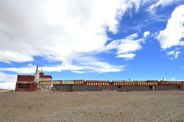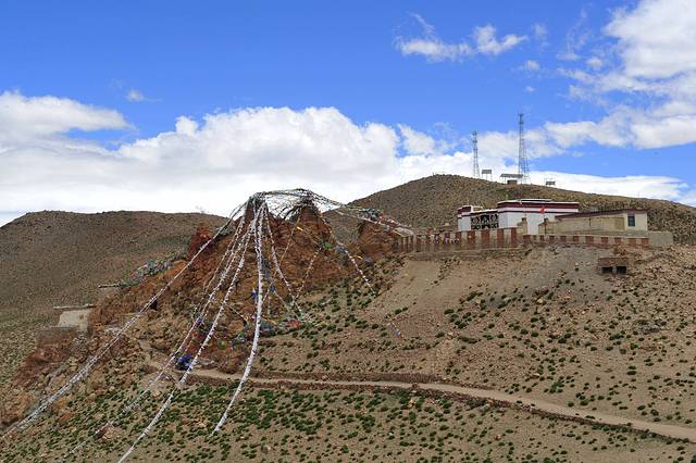 做行程时,没注意到吉乌寺,后查资料得知,吉乌寺所在山被信徒们称为桑朵白日山,其意为铜色山,是莲花生大师所居净土圣地名,从山顶居高临下,可以将玛旁雍措尽收眼底。因为寺庙地处前往普兰县 的交通要道,所以前来朝圣的信徒众多。据传莲花生大师曾在此降魔伏妖时逗留过七天,并在寺庙所在山体的洞穴中修行多日,山体的西南面至今保留着该修行洞。吉乌寺因莲花生大师的传说在当年也被称之为吉乌莲花城堡,岩石上还留下其脚印多处。 寺庙最早供奉的是一尊整根檀香木雕刻而成的莲花生大师像,寺外是一排壮丽的白塔依次排开。后来由顶钦顿珠在此兴建了竹巴嘎举派寺庙,从此寺庙改为竹巴噶举派寺庙。现在其内的主供为莲花生大师的药泥塑像。后悔来回路程经过没有进入寺庙。
