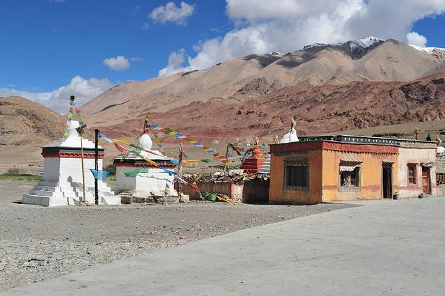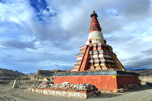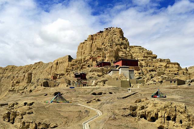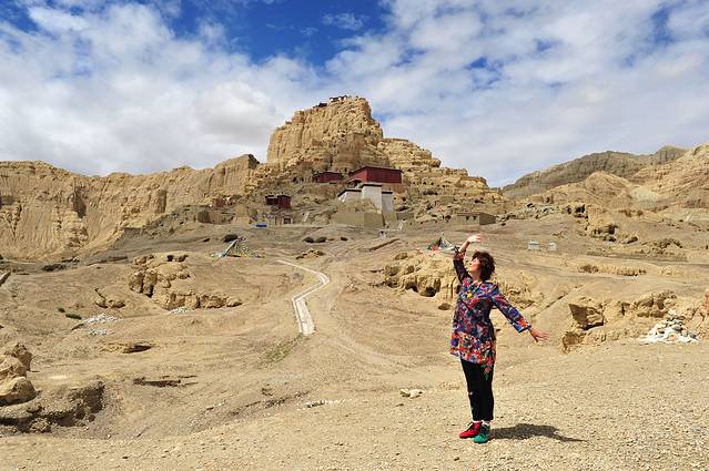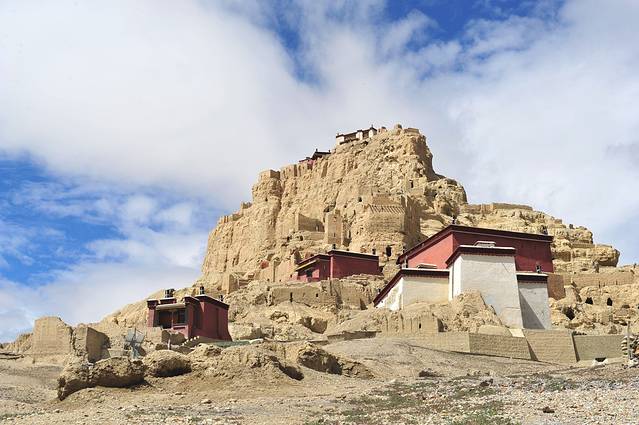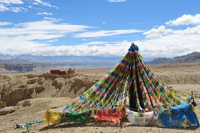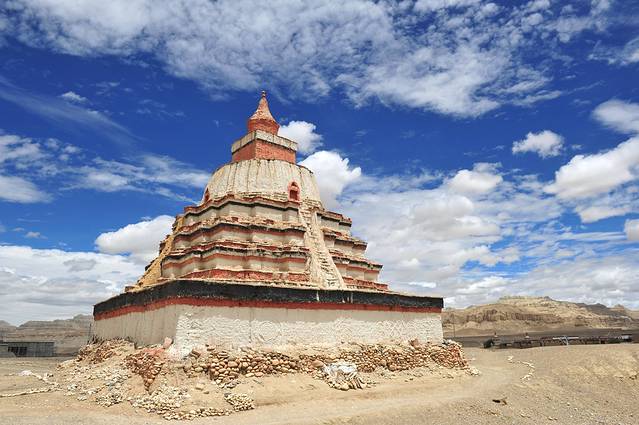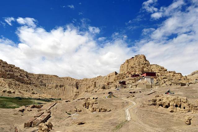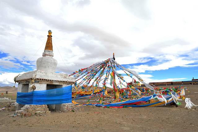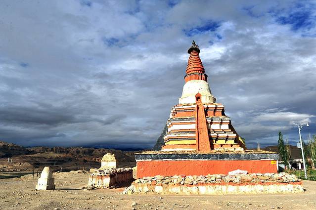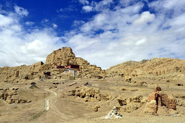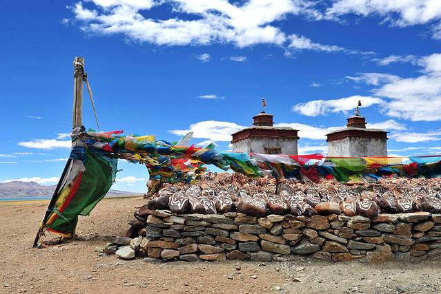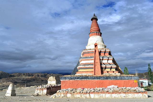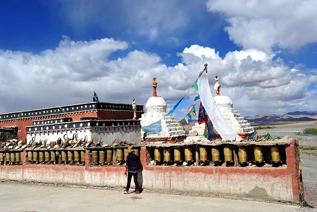 做行程时,没注意到吉乌寺,后查资料得知,吉乌寺所在山被信徒们称为桑朵白日山,其意为铜色山,是莲花生大师所居净土圣地名,从山顶居高临下,可以将玛旁雍措尽收眼底。因为寺庙地处前往普兰县 的交通要道,所以前来朝圣的信徒众多。据传莲花生大师曾在此降魔伏妖时逗留过七天,并在寺庙所在山体的洞穴中修行多日,山体的西南面至今保留着该修行洞。吉乌寺因莲花生大师的传说在当年也被称之为吉乌莲花城堡,岩石上还留下其脚印多处。 寺庙最早供奉的是一尊整根檀香木雕刻而成的莲花生大师像,寺外是一排壮丽的白塔依次排开。后来由顶钦顿珠在此兴建了竹巴嘎举派寺庙,从此寺庙改为竹巴噶举派寺庙。现在其内的主供为莲花生大师的药泥塑像。后悔来回路程经过没有进入寺庙。