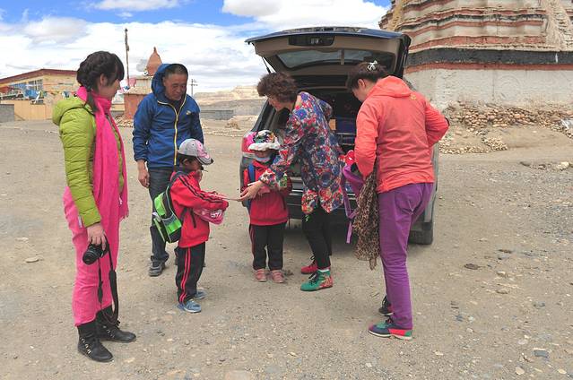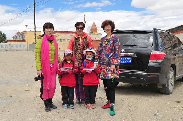 看到两个中午放学的孩子,陈姐把带的一些儿童读物书籍送给两个小女孩。