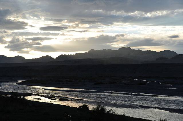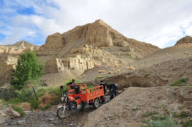 太阳逐渐落下,想到古格遗址去拍日落,赶紧驱车前往19公里外的古格遗址,路上看到有人从河中取水。扎达城中缺水是一定的,我们住的旅店,洗脸、冲厕所都要从桶中舀水。