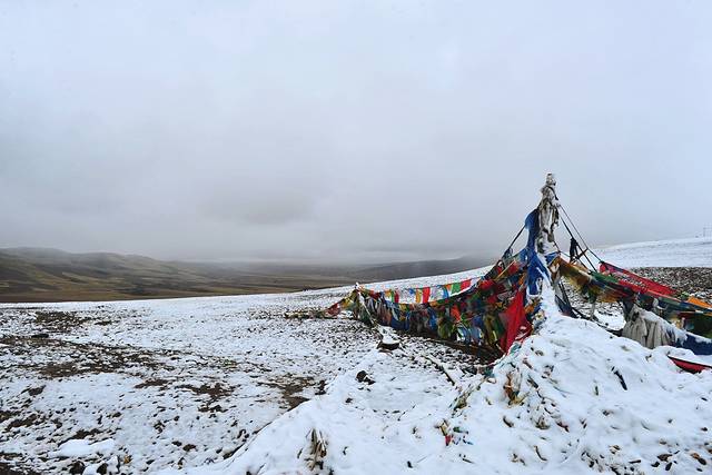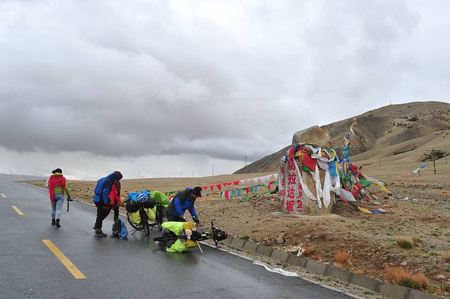 雨雪雾中经过海拔4636米的雅切拉达坂,几位骑行的年轻人在此整理行装。