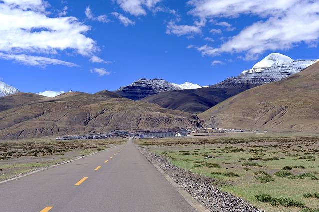 我们不去转山,但要了解如何转山,先来到转山的入口处,左边是塔尔钦,右边岗仁波齐峰。