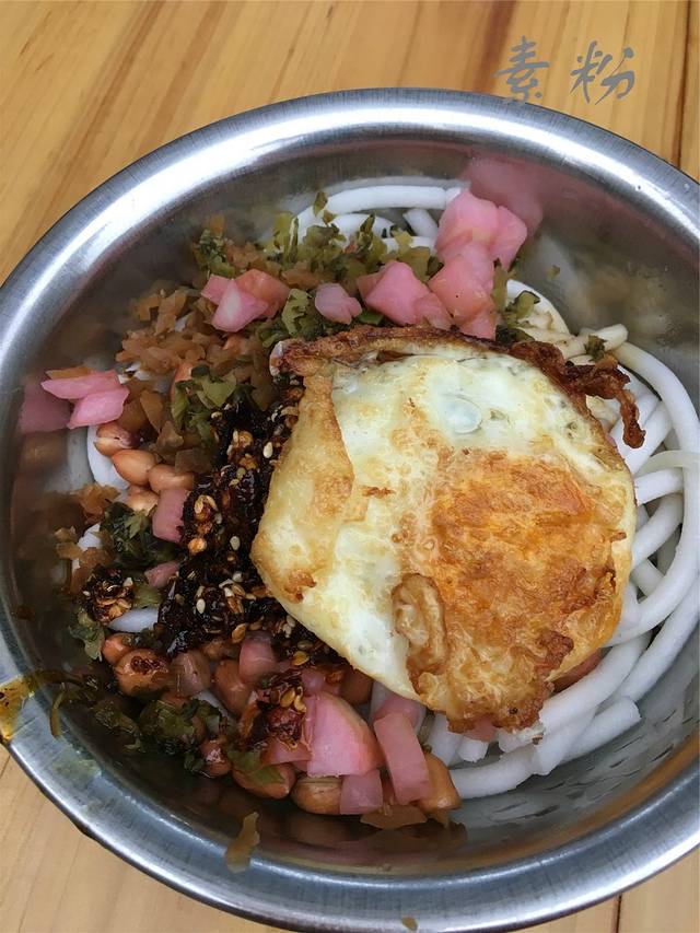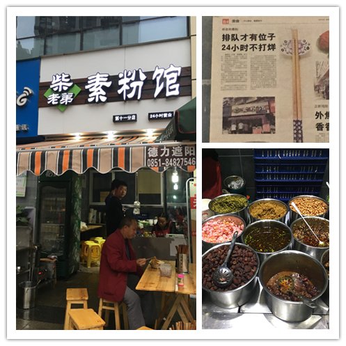 3、素粉:贵阳小吃之一。公交车斜对面看到这家柴老弟素粉馆,店内还摆放着宣传他们家的报纸。要了一碗简单的素粉,好像是6块钱。放了酸萝卜,花生,油辣椒,还有一个煎蛋。很辣却很香,这是我最喜欢的早餐了。