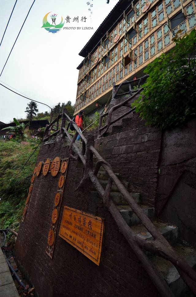 我们在1号风雨桥乘坐到达观景台的交通车,和司机师傅说一声到嘎百福客栈,司机就会中途在客栈门口停下来。老板向姐是一个很热情的人,看到我们下车了,就在客栈门口的楼梯处迎接我们。check in以后告诉我们下午可以怎么玩苗寨。