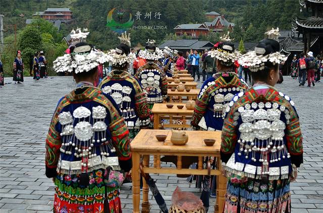 他们大致分为四列,两边的前面是男性的长者,吹着像是芦苼?后面是年龄较大的阿姨,满身的银饰。中间两排是妙龄少女,都穿着苗家的漂亮的衣服,化着浓妆,打头的一个是最漂亮的。如果想和小姑娘合照,必须先喝下她递过来的拦门酒。我喝的拦门酒应该是米酒,清凉甘甜,但是后劲大。喝酒的时候手不要碰杯子,如果碰了杯子,阿妹会以为你还想喝,会再递给你第二杯拦门酒。